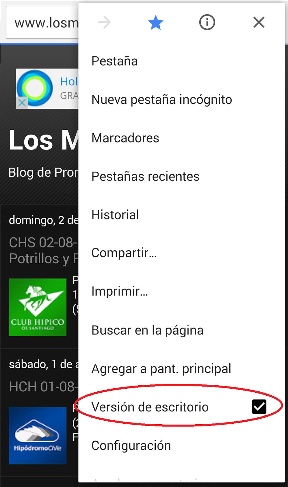 Recuerda que si deseas acceder a la versión completa del sitio web y ver noticias, el caballo de la semana, vídeos, volantes y mucho más, debes activar la opción "versión de escritorio" en tu teléfono celular como puedes verlo a continuación...